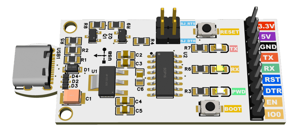 - ๐ข Debug-friendly: RESET/BOOT buttons, jumpers to disable auto-reset.